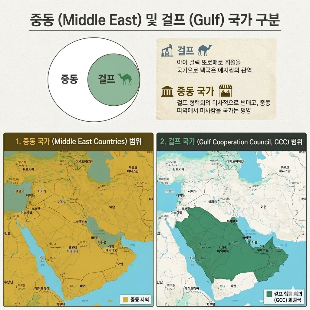 즉 중동이라는 큰 지역 안에 걸프 국가들이 포함되어 있다고 이해하면 됩니다.