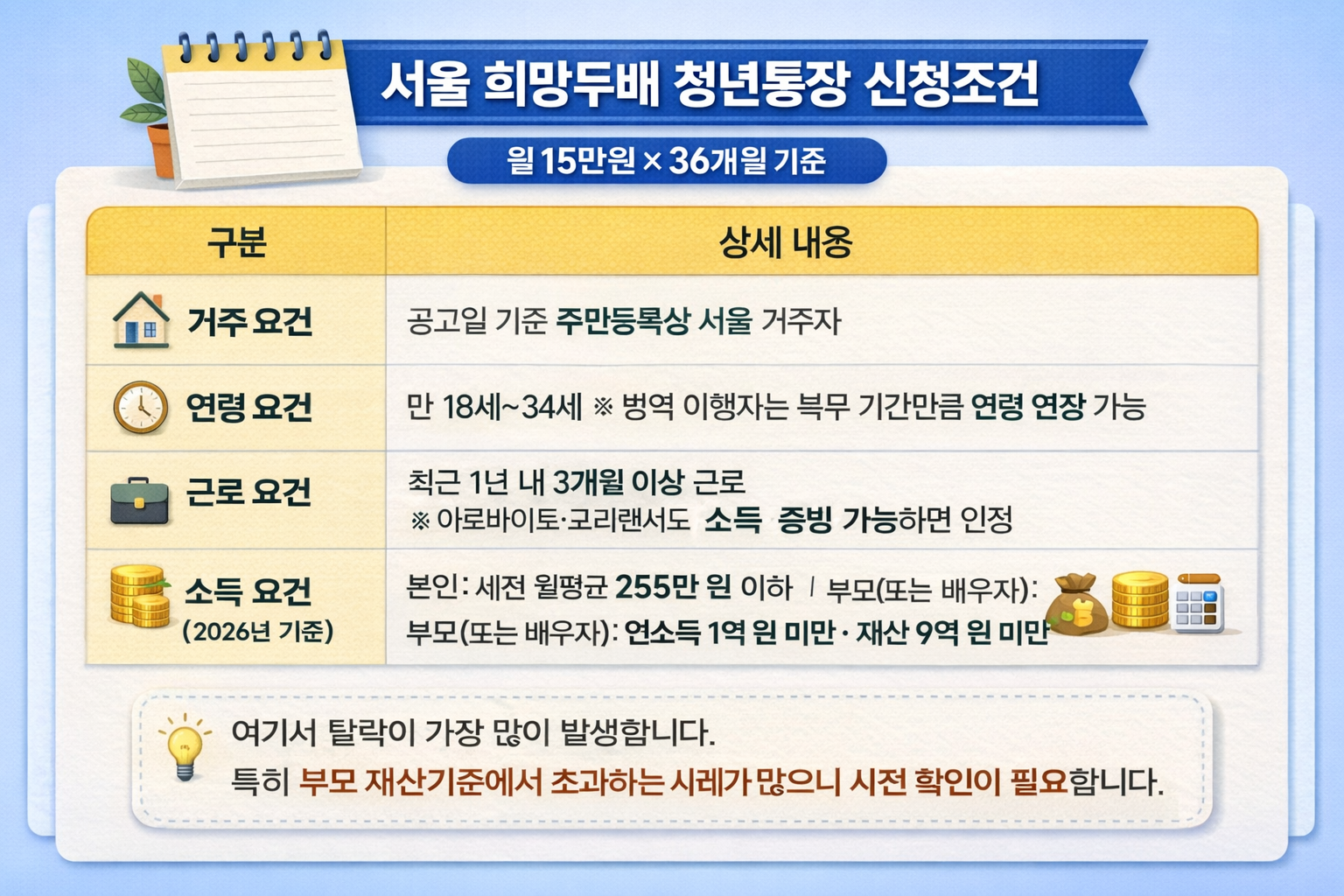 서울 희망두배통장 조건, 서울 희망두배통장 소득 기준, 서울 희망두배통장 신청기간을 정확히 이해해야 탈락 없이 준비할 수 있습니다.