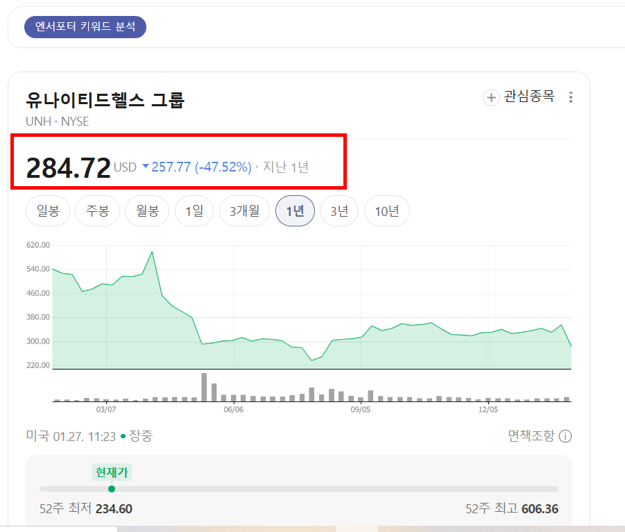 미국 헬스케어 업종을 대표하는 기업인 유나이티드헬스 그룹(UnitedHealth Group, UNH) 주가가 오늘 시장에서 큰 폭의 하락세를 보이고 있다.